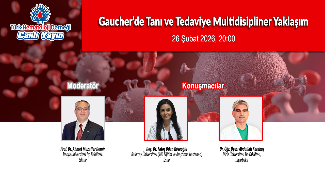 19.01.2026 Sayın Katılımcı, Türk Hematoloji Derneği tarafından 26 Şubat 2026 Perşembe saat 20:00’da “Gaucher’de Tanı ve Tedaviye Multidisipliner Yaklaşım” konulu toplantı Prof. Dr. Ahmet Muzaffer Demir’in moderatörlüğünde, Doç. Dr. Fatoş Dilan Köseoğlu ve Dr. Öğr. Üyesi Abdullah Karakuş’un sunumlarıyla interaktif olarak canlı yayınlanacaktır. T.C. Sağlık Bakanlığı’nın yayımlamış olduğu “Beşeri Tıbbi Ürünlerin Tanıtım Faaliyetleri Hakkında Yönetmelik” kapsamında “Elektronik Bilimsel Toplantı ve Elektronik Ürün Tanıtım Toplantıları Başvuru Kılavuzu” ile belirlenen kurallara göre tüm online etkinliklerde her etkinlik için kişiye özel kayıt yapılması gerekmektedir. Bu kural doğrultusunda canlı yayınları izleyebilmek için Serenaslive'a üye olmalısınız. Serenaslive’a üye olduktan sonra, katılacağınız dijital etkinlik için ayrıca etkinlik kaydı oluşturmanız gerekecektir. https://thd.serenaslive.com/ConferenceForm/Index?hallId=1